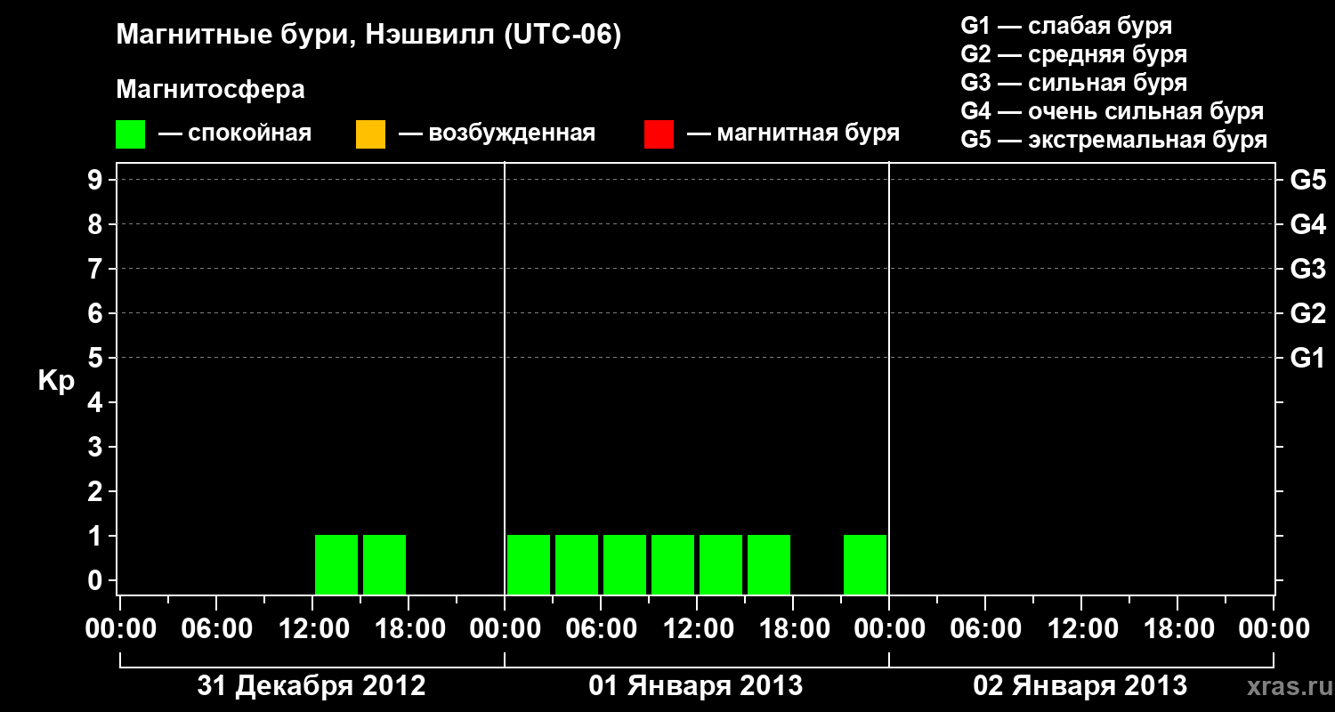 Изменения геомагнитного индекса Kp с 31 декабря 2012 года по 2 января 2013 года для средних широт