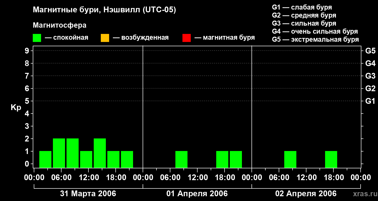 Изменения геомагнитного индекса Kp с 31 марта по 2 апреля 2006 года для средних широт