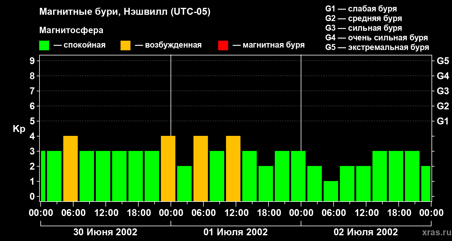Изменения геомагнитного индекса Kp с 30 июня по 2 июля 2002 года для средних широт