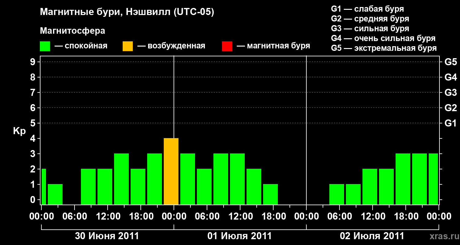 Изменения геомагнитного индекса Kp с 30 июня по 2 июля 2011 года для средних широт