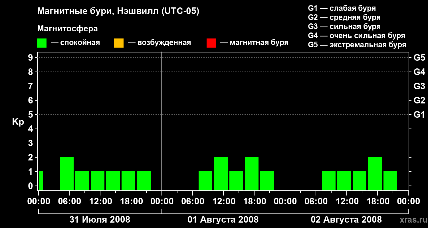 Изменения геомагнитного индекса Kp с 31 июля по 2 августа 2008 года для средних широт