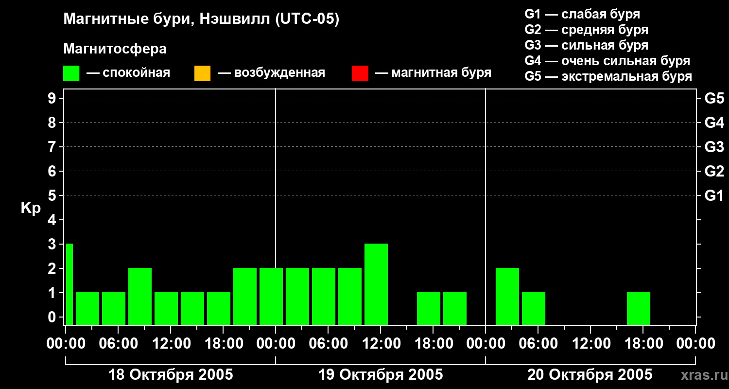 Изменения геомагнитного индекса Kp с 18 по 20 октября 2005 года для средних широт