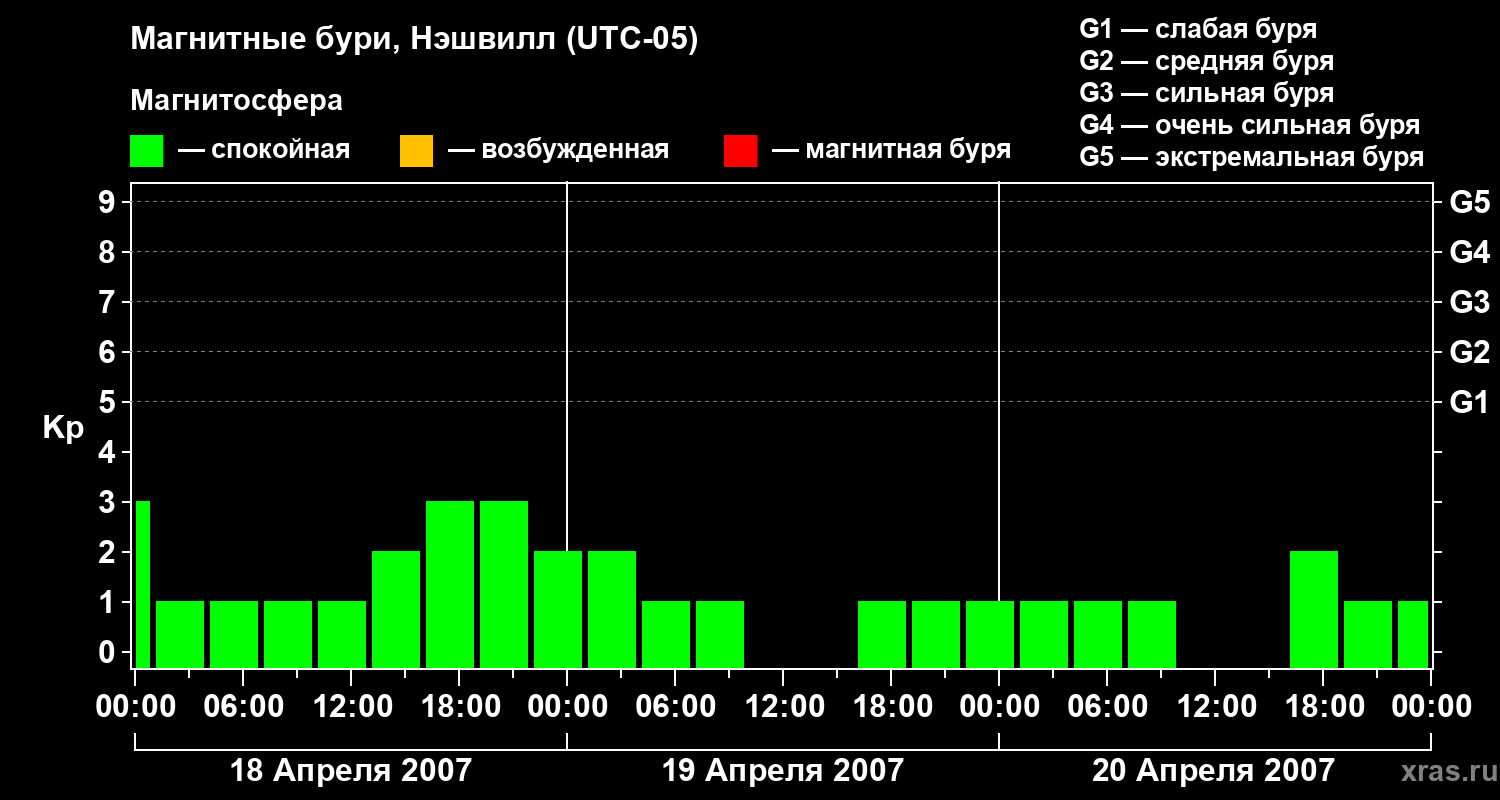 Изменения геомагнитного индекса Kp с 18 по 20 апреля 2007 года для средних широт