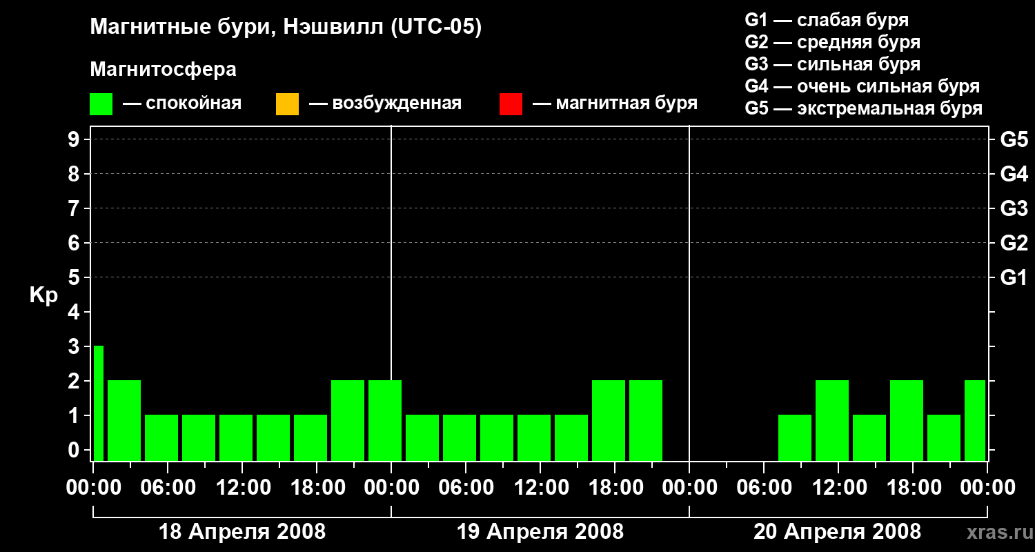 Изменения геомагнитного индекса Kp с 18 по 20 апреля 2008 года для средних широт