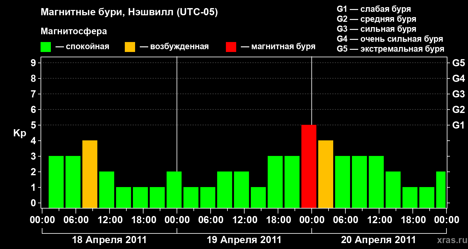 Изменения геомагнитного индекса Kp с 18 по 20 апреля 2011 года для средних широт