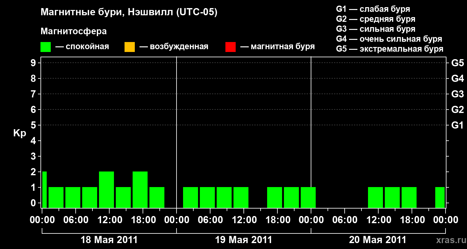 Изменения геомагнитного индекса Kp с 18 по 20 мая 2011 года для средних широт