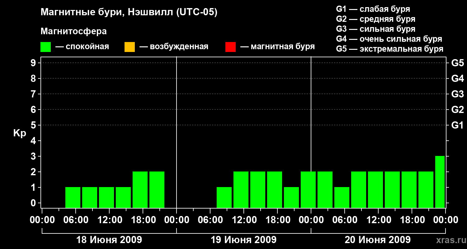Изменения геомагнитного индекса Kp с 18 по 20 июня 2009 года для средних широт