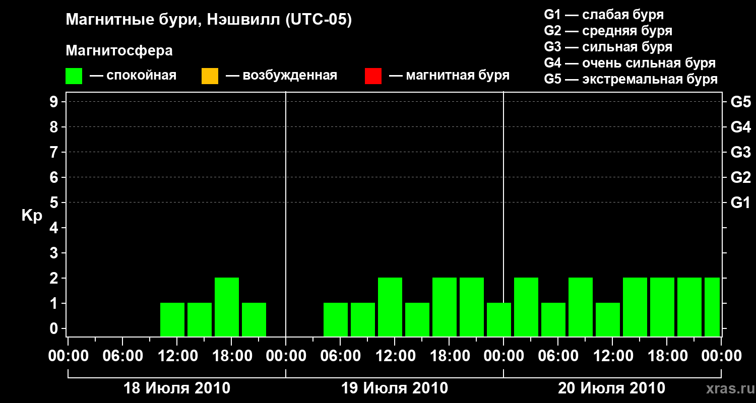 Изменения геомагнитного индекса Kp с 18 по 20 июля 2010 года для средних широт