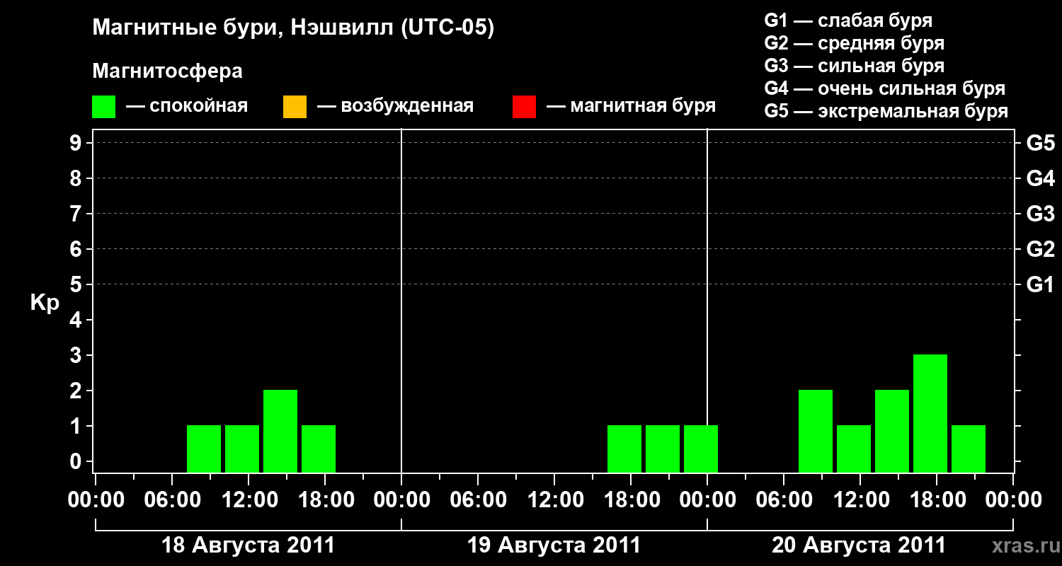 Изменения геомагнитного индекса Kp с 18 по 20 августа 2011 года для средних широт