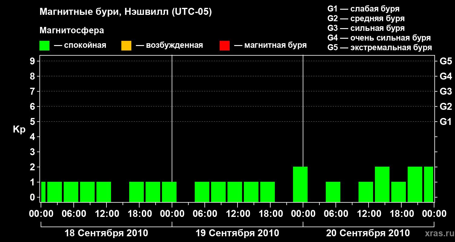 Изменения геомагнитного индекса Kp с 18 по 20 сентября 2010 года для средних широт