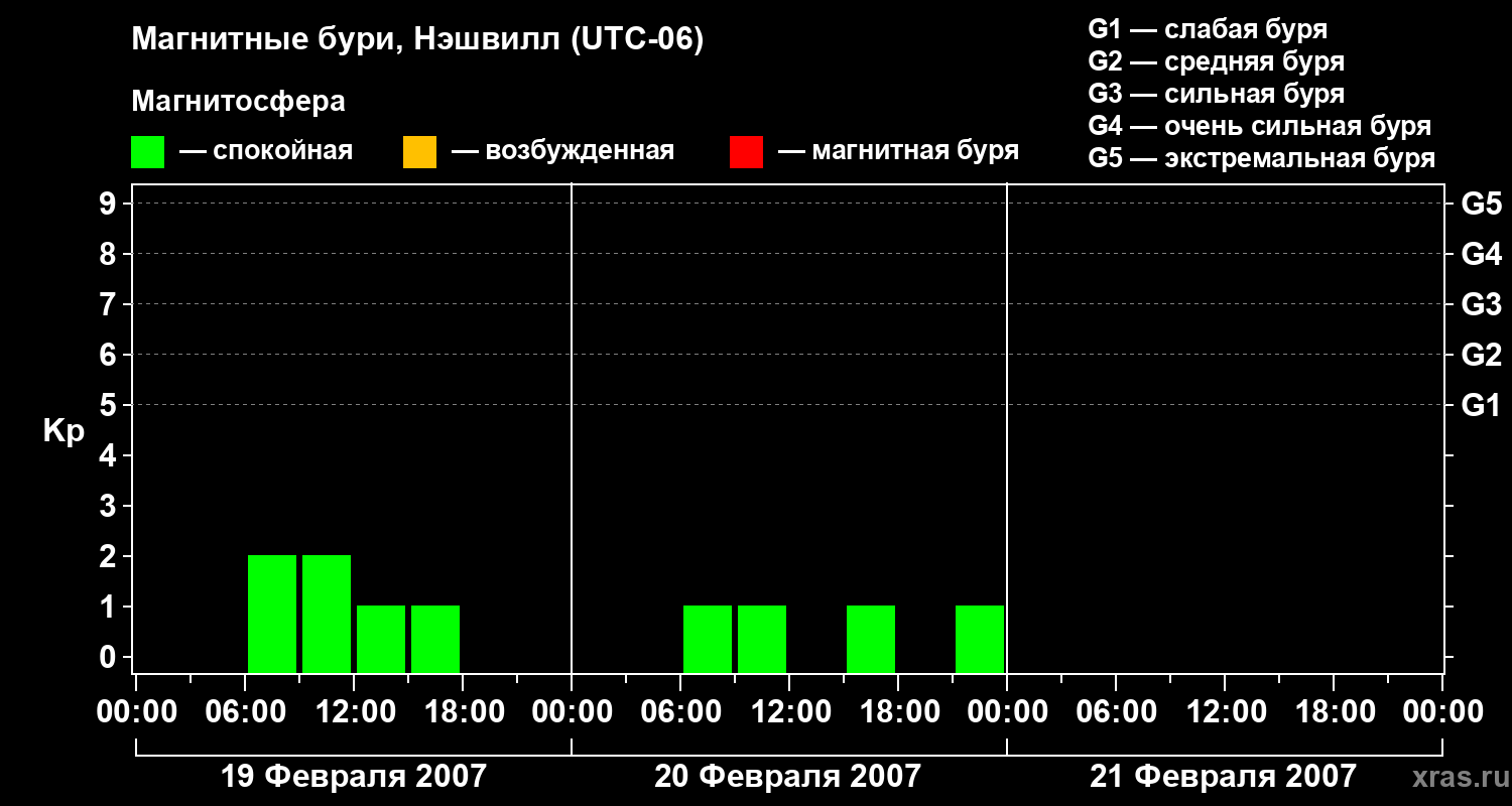 Изменения геомагнитного индекса Kp с 19 по 21 февраля 2007 года для средних широт