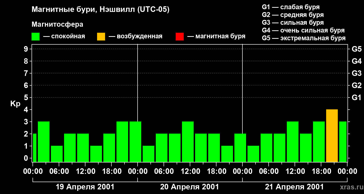 Изменения геомагнитного индекса Kp с 19 по 21 апреля 2001 года для средних широт