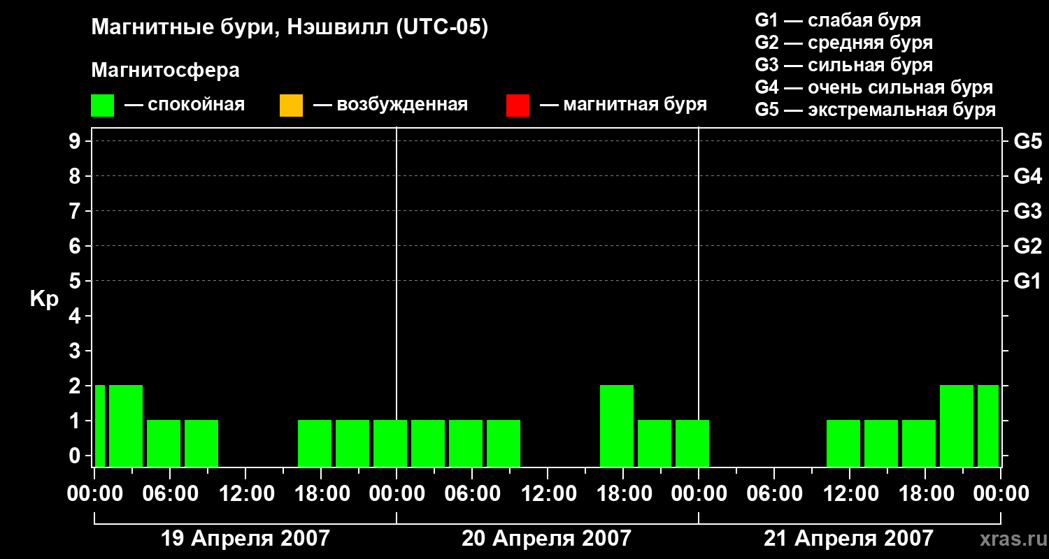 Изменения геомагнитного индекса Kp с 19 по 21 апреля 2007 года для средних широт