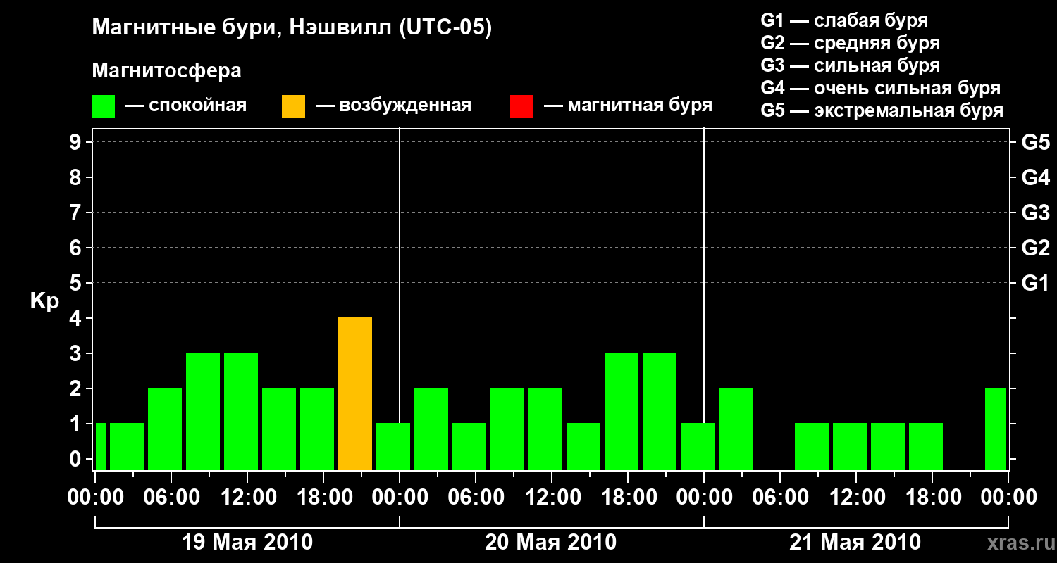 Изменения геомагнитного индекса Kp с 19 по 21 мая 2010 года для средних широт