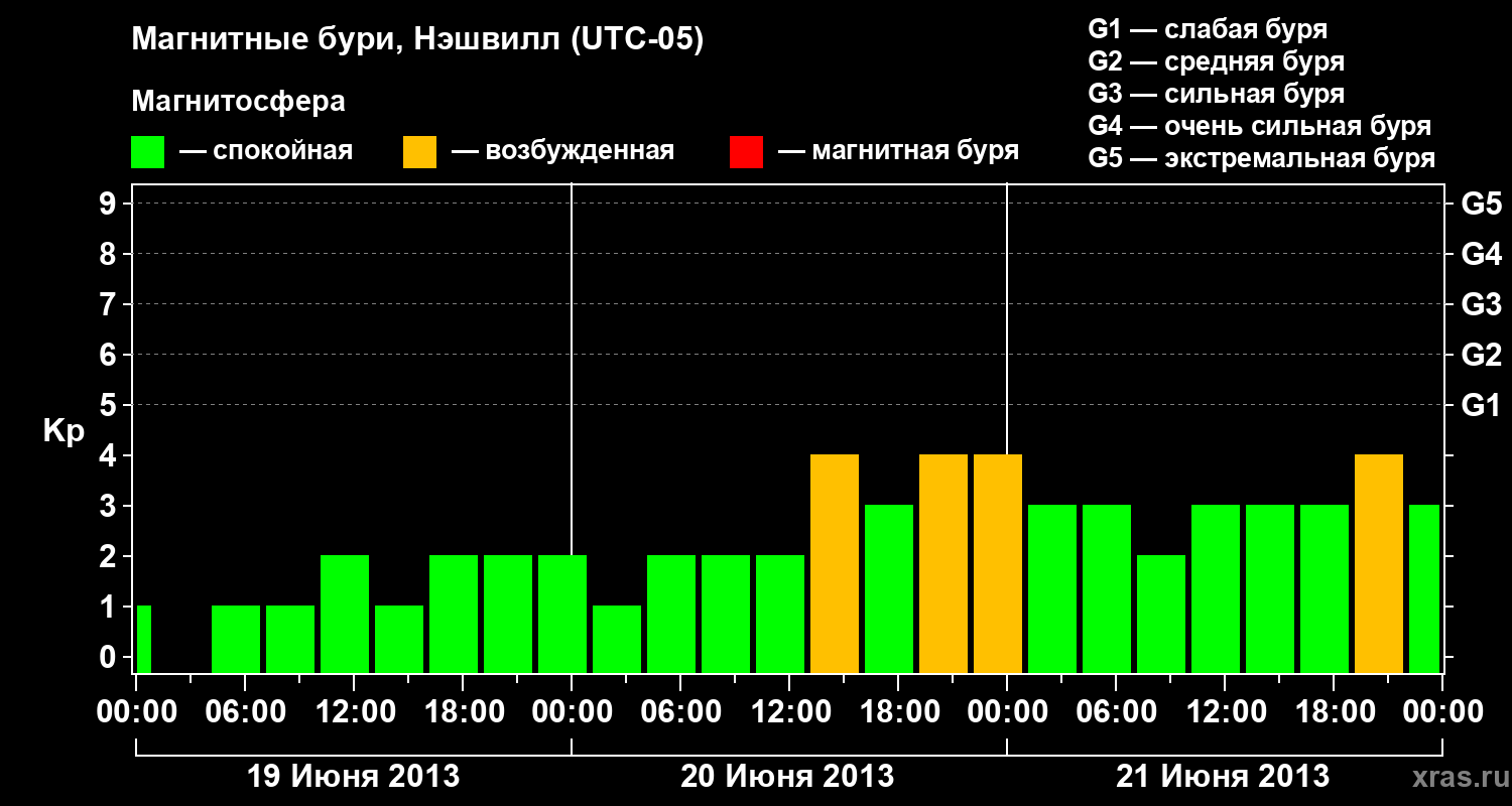 Изменения геомагнитного индекса Kp с 19 по 21 июня 2013 года для средних широт