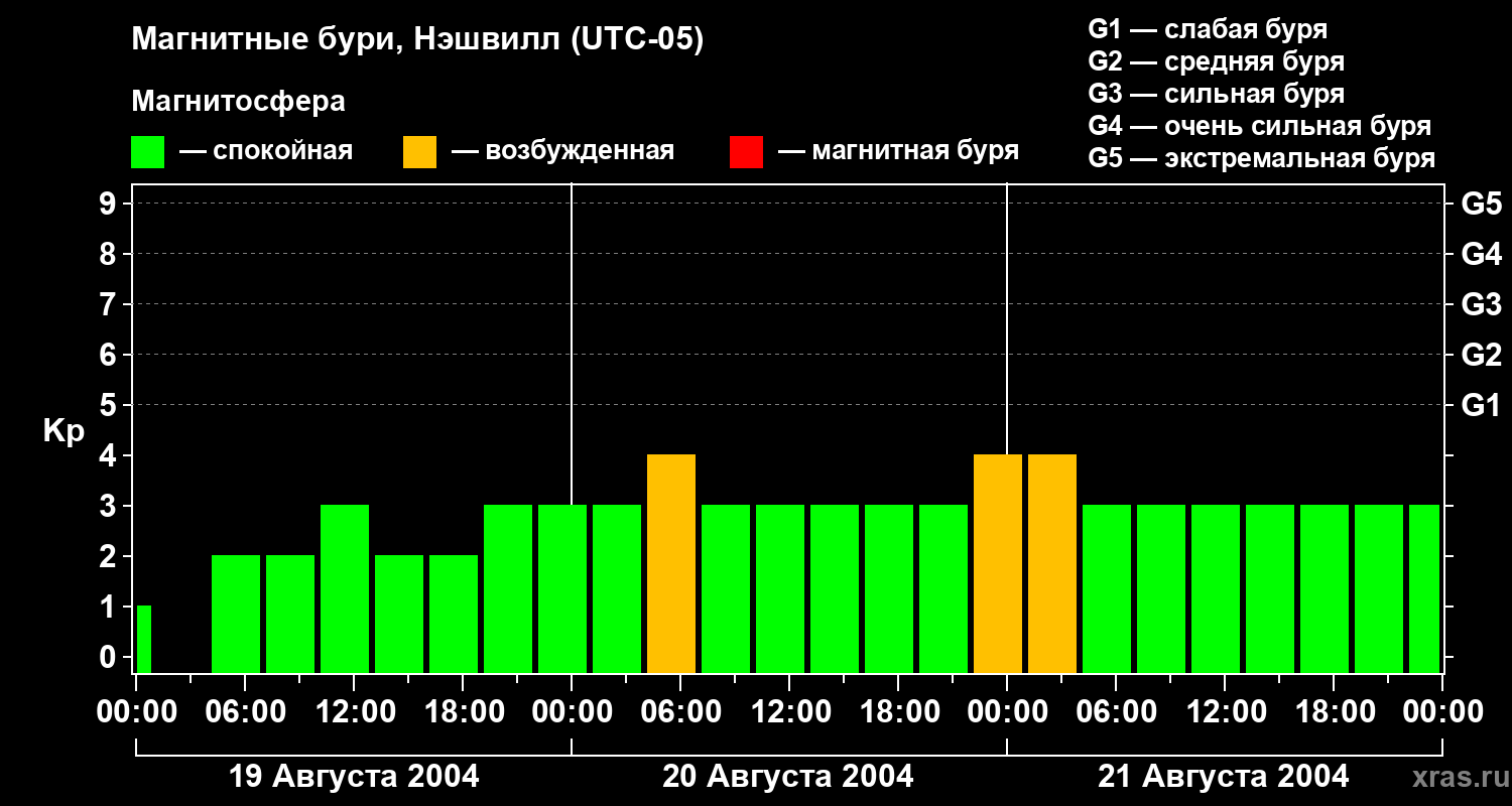 Изменения геомагнитного индекса Kp с 19 по 21 августа 2004 года для средних широт