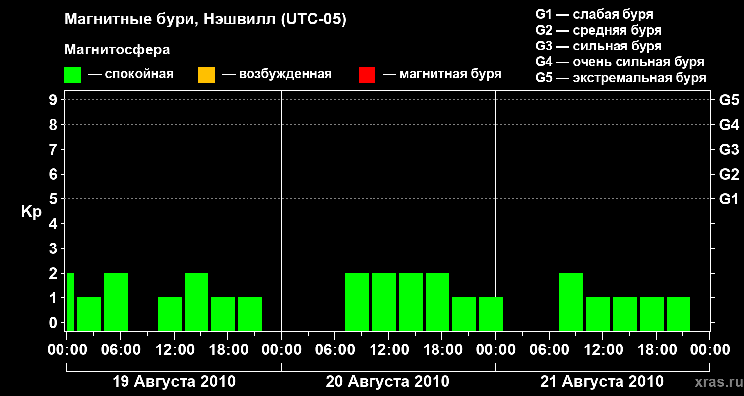 Изменения геомагнитного индекса Kp с 19 по 21 августа 2010 года для средних широт