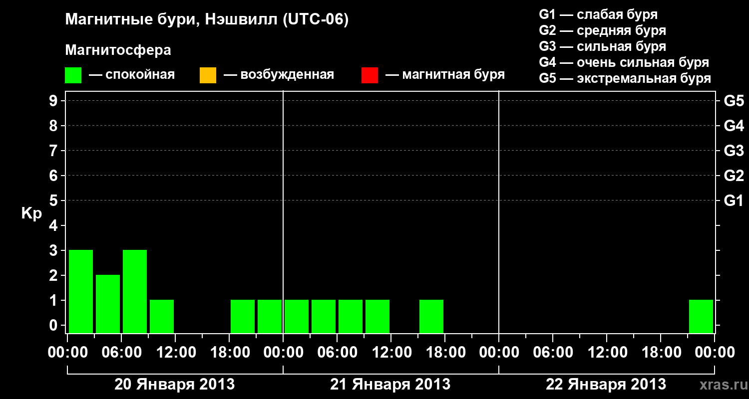 Изменения геомагнитного индекса Kp с 20 по 22 января 2013 года для средних широт