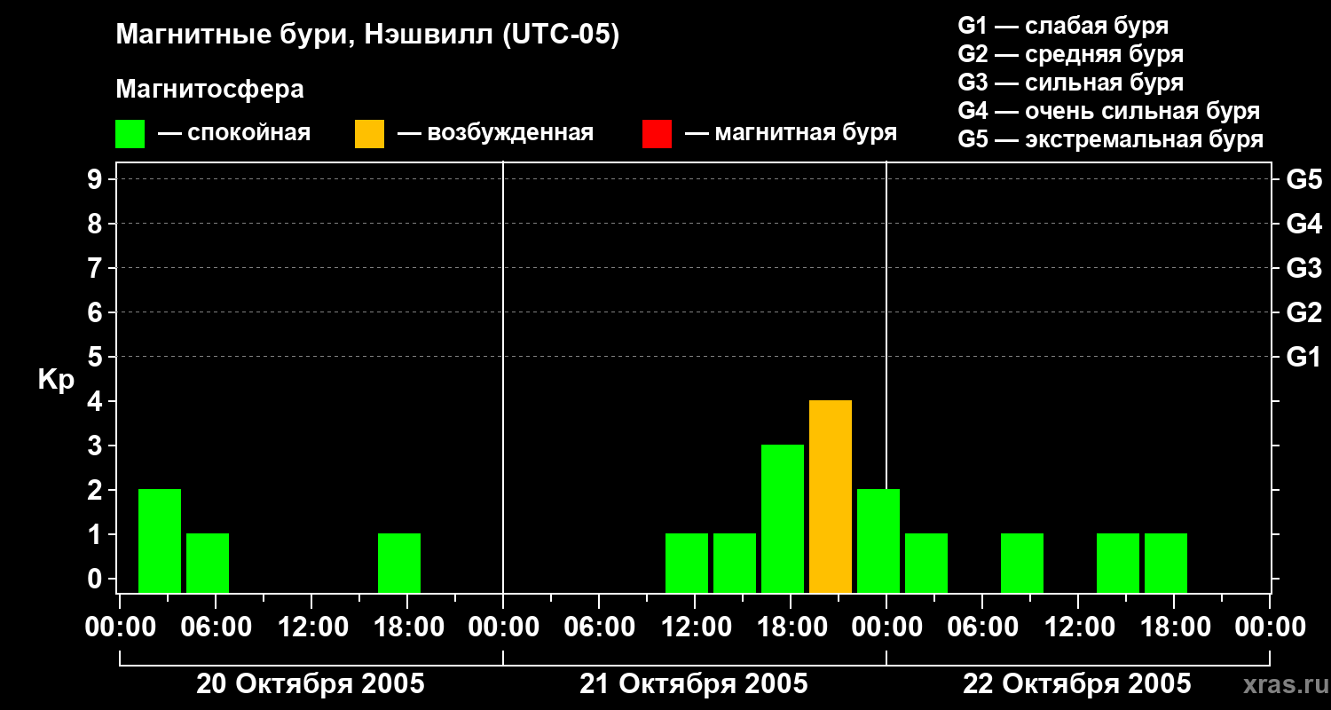 Изменения геомагнитного индекса Kp с 20 по 22 октября 2005 года для средних широт
