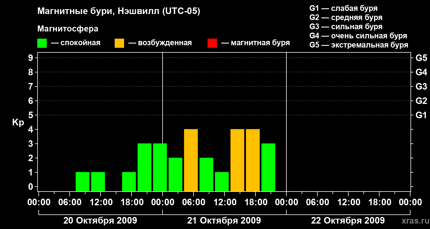 Изменения геомагнитного индекса Kp с 20 по 22 октября 2009 года для средних широт