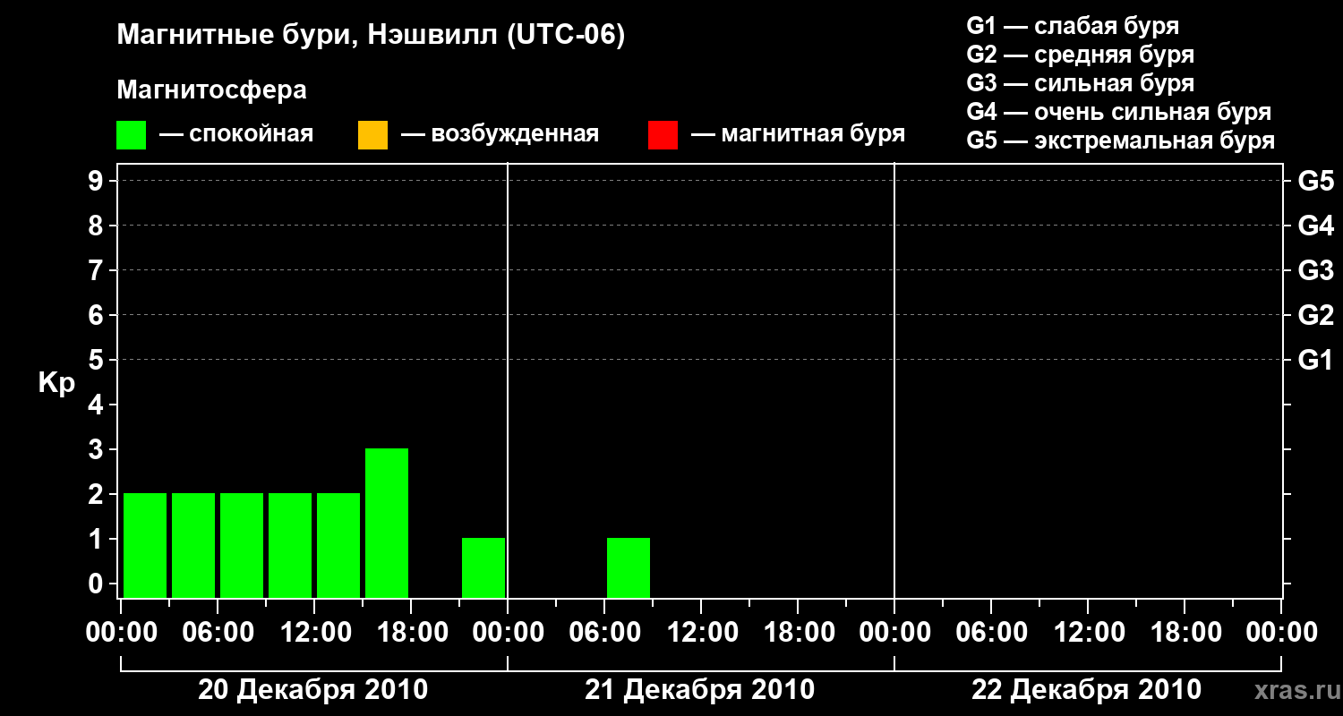 Изменения геомагнитного индекса Kp с 20 по 22 декабря 2010 года для средних широт
