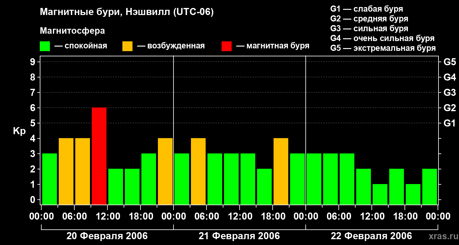 Изменения геомагнитного индекса Kp с 20 по 22 февраля 2006 года для средних широт