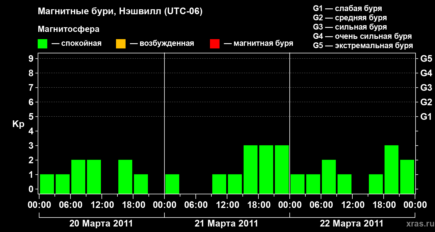 Изменения геомагнитного индекса Kp с 20 по 22 марта 2011 года для средних широт