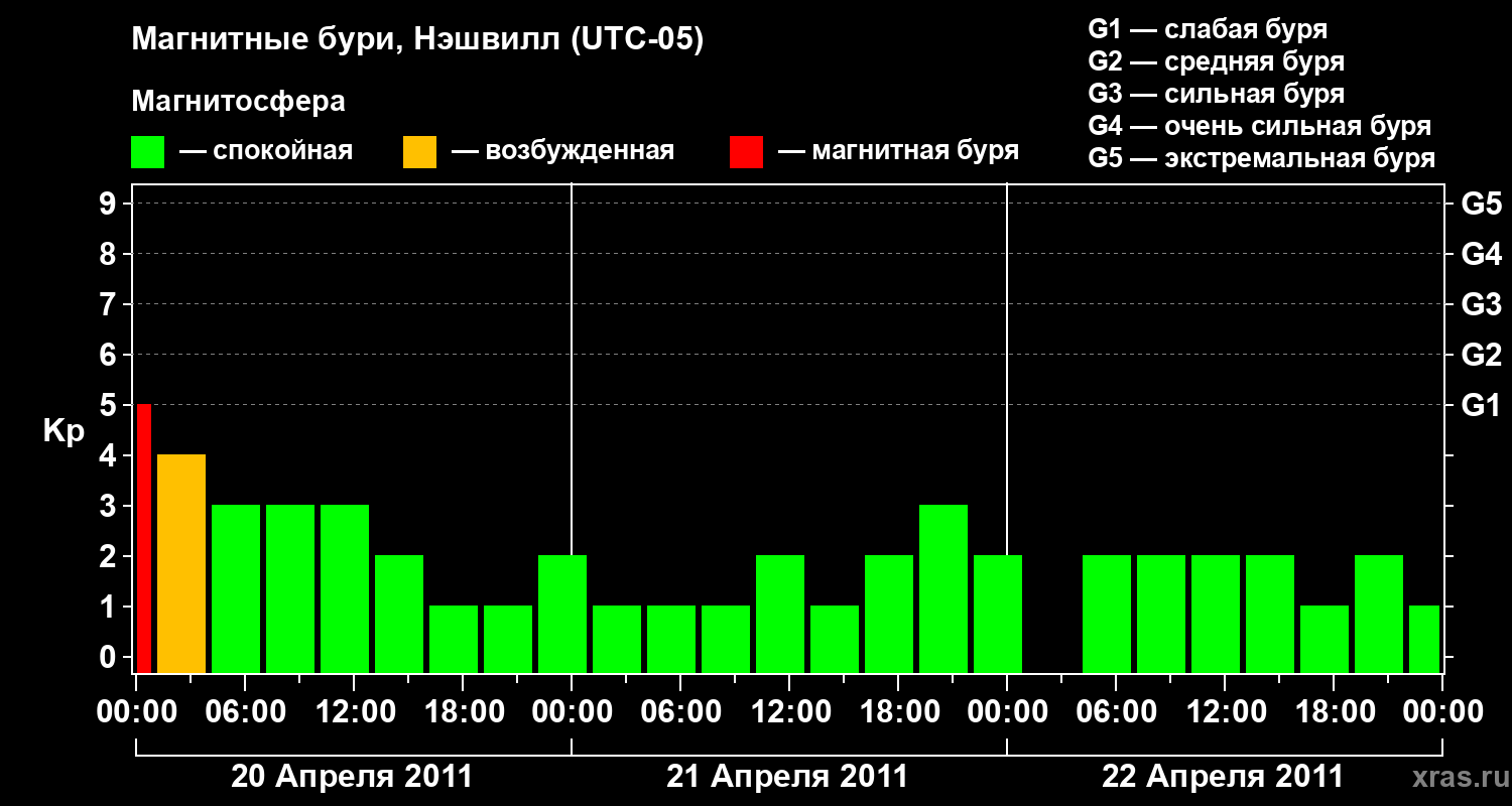 Изменения геомагнитного индекса Kp с 20 по 22 апреля 2011 года для средних широт