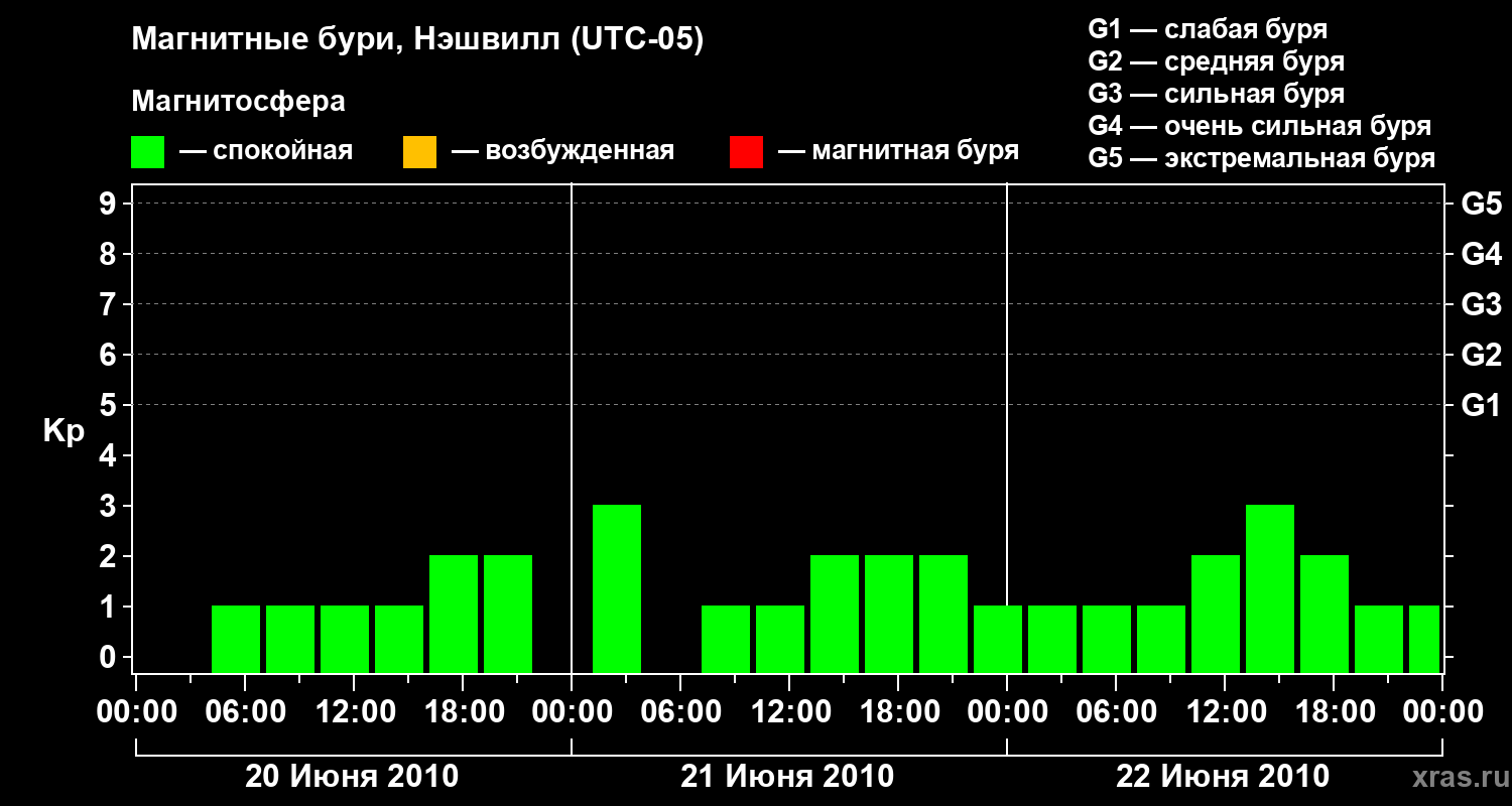 Изменения геомагнитного индекса Kp с 20 по 22 июня 2010 года для средних широт