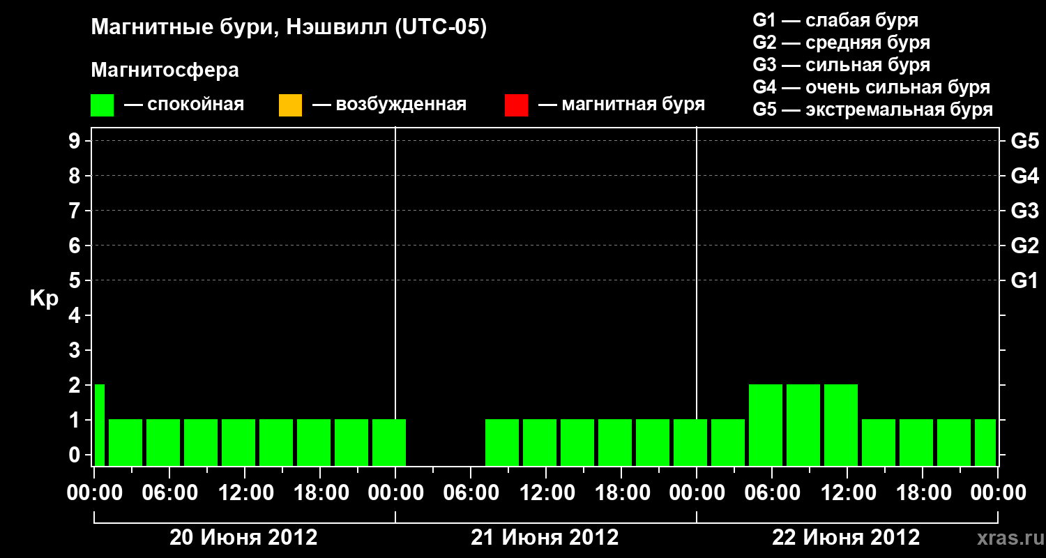 Изменения геомагнитного индекса Kp с 20 по 22 июня 2012 года для средних широт