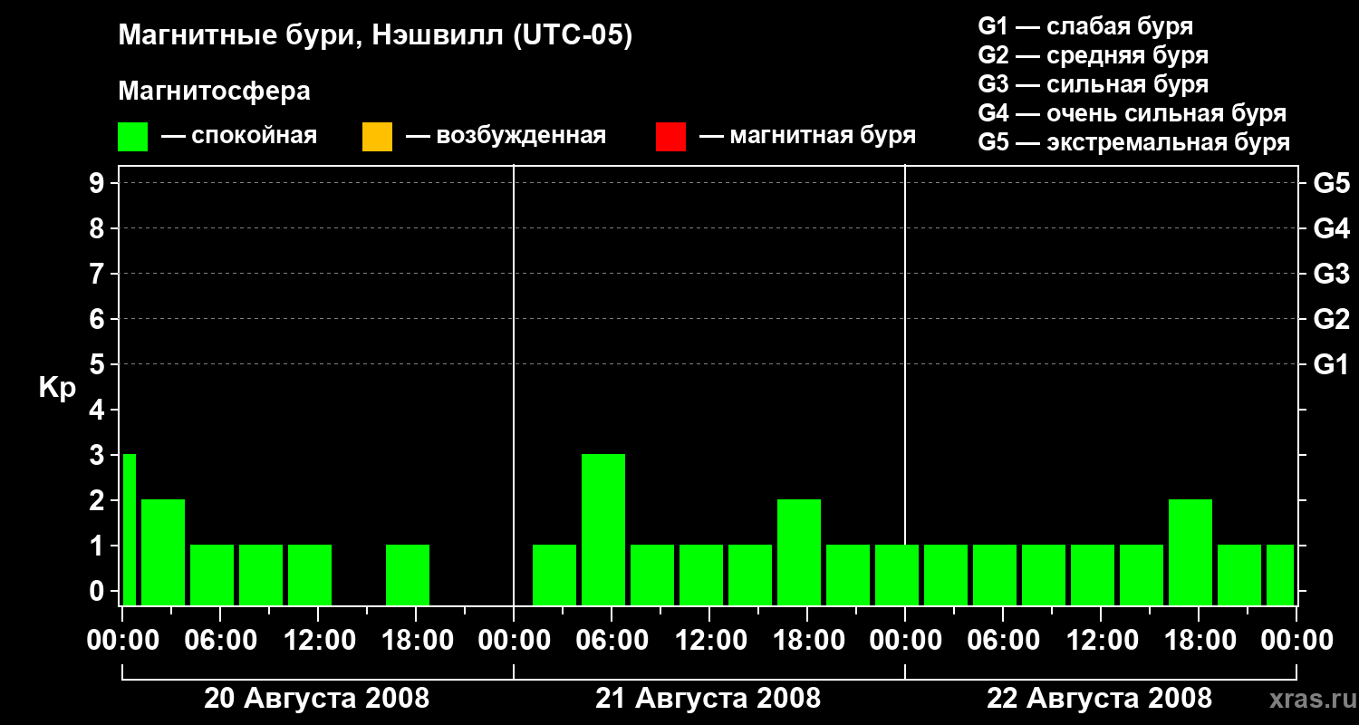 Изменения геомагнитного индекса Kp с 20 по 22 августа 2008 года для средних широт