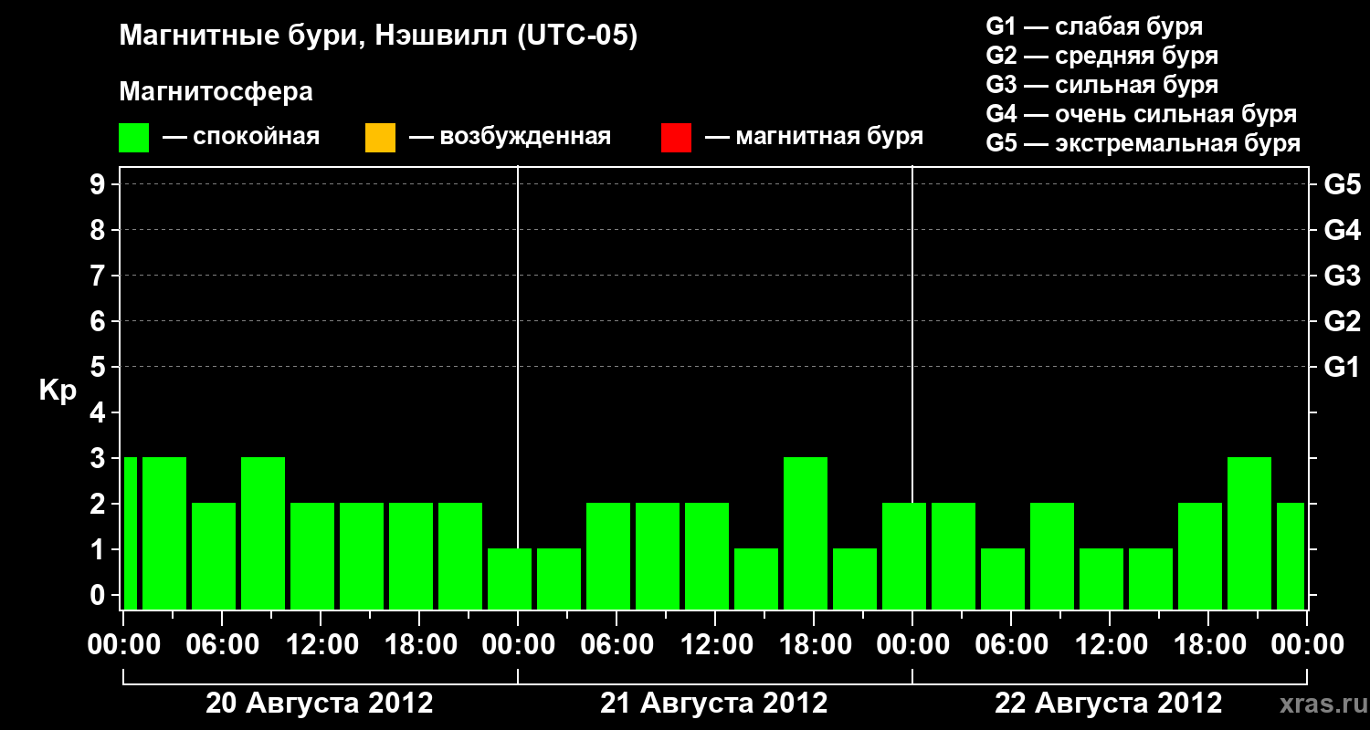 Изменения геомагнитного индекса Kp с 20 по 22 августа 2012 года для средних широт