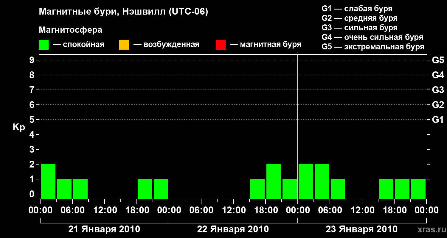 Изменения геомагнитного индекса Kp с 21 по 23 января 2010 года для средних широт