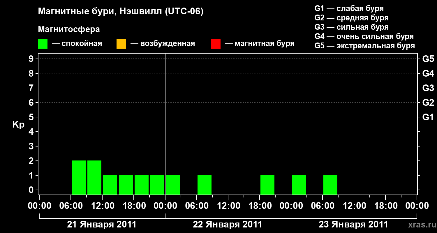Изменения геомагнитного индекса Kp с 21 по 23 января 2011 года для средних широт