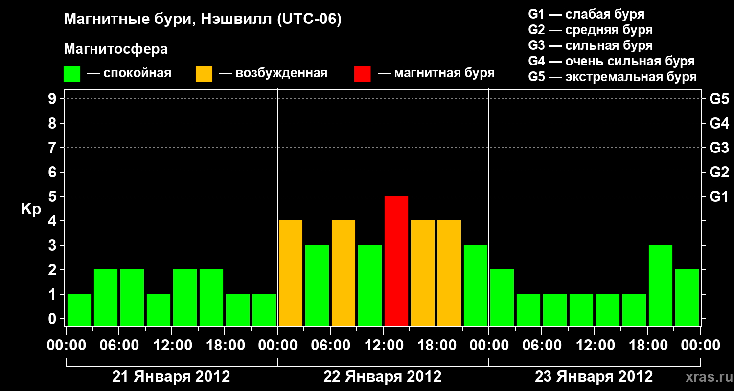 Изменения геомагнитного индекса Kp с 21 по 23 января 2012 года для средних широт