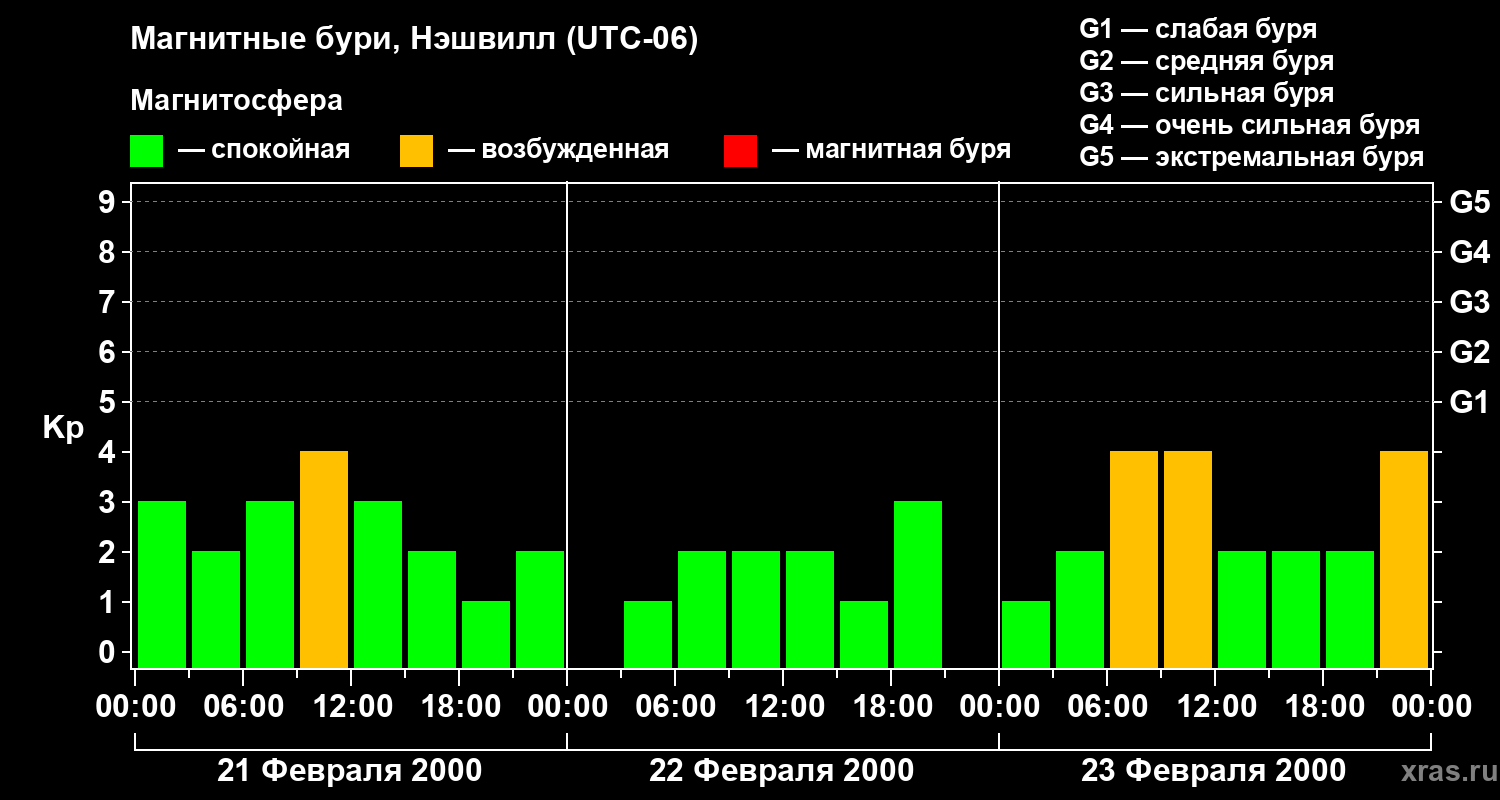 Изменения геомагнитного индекса Kp с 21 по 23 февраля 2000 года для средних широт