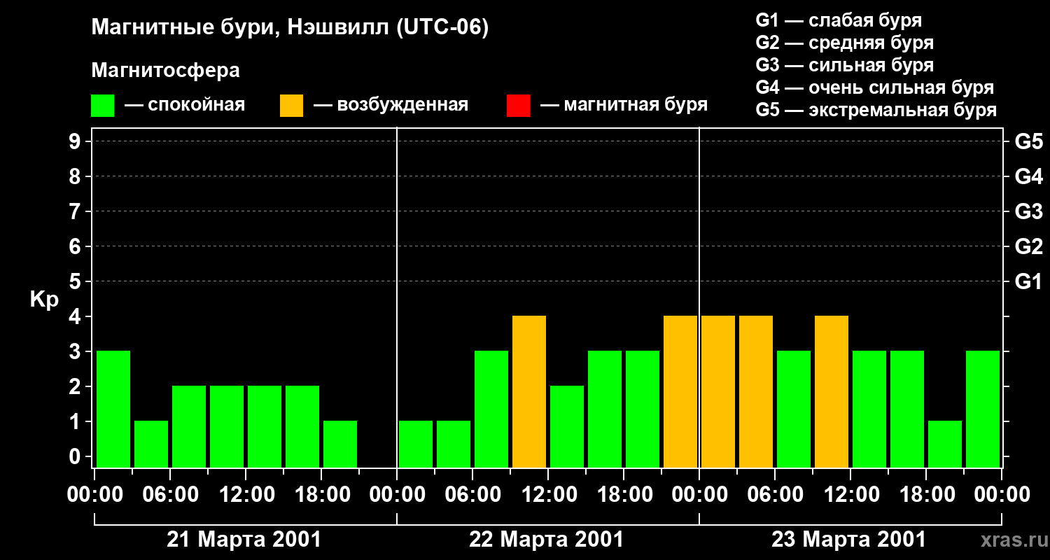 Изменения геомагнитного индекса Kp с 21 по 23 марта 2001 года для средних широт