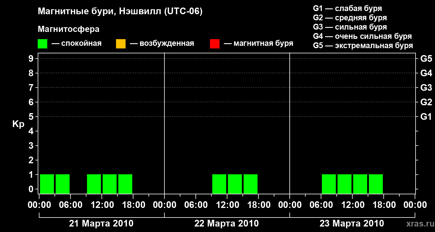 Изменения геомагнитного индекса Kp с 21 по 23 марта 2010 года для средних широт
