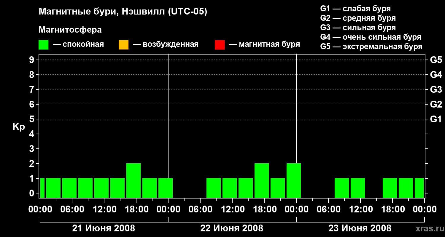 Изменения геомагнитного индекса Kp с 21 по 23 июня 2008 года для средних широт