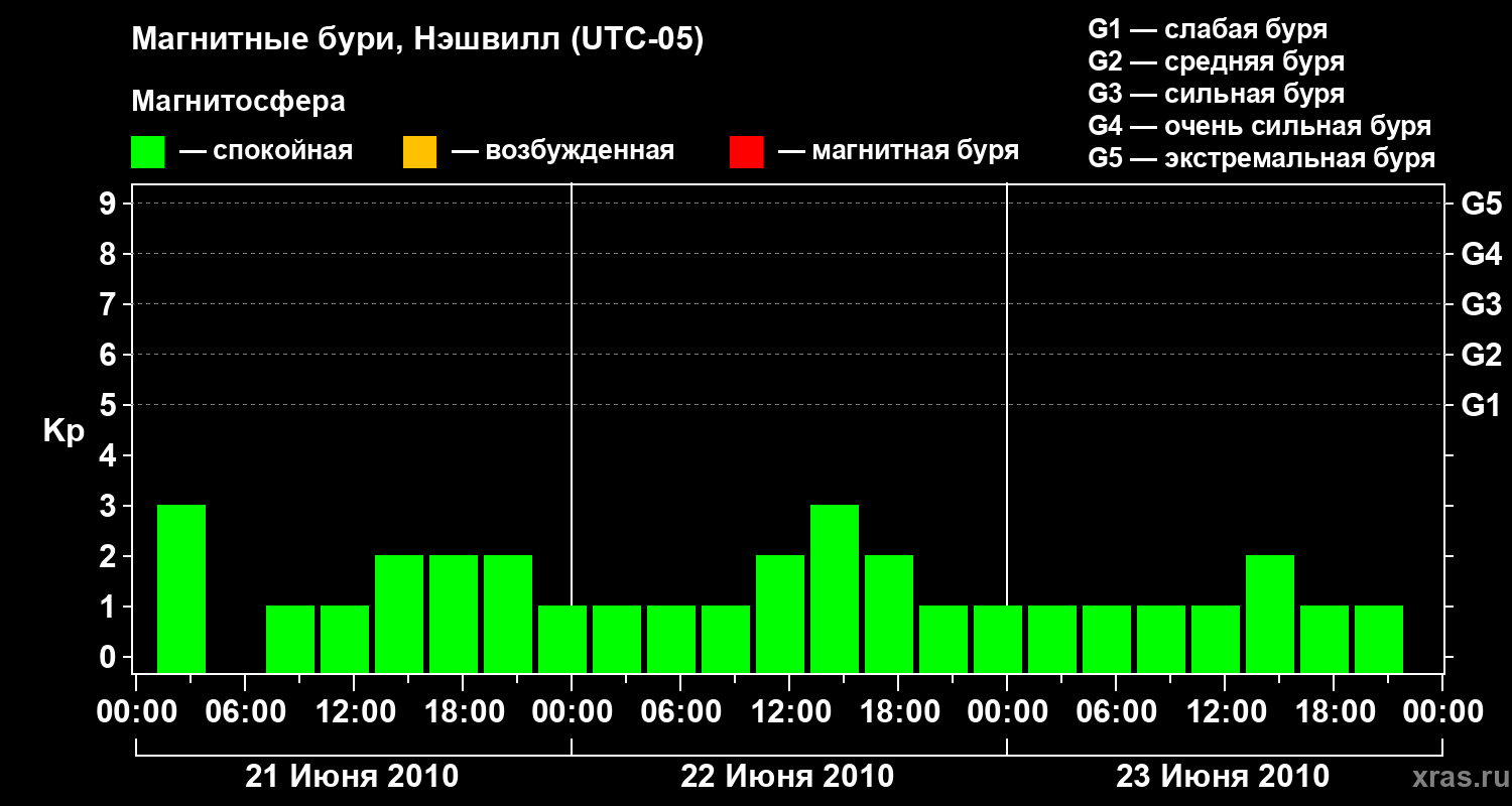 Изменения геомагнитного индекса Kp с 21 по 23 июня 2010 года для средних широт