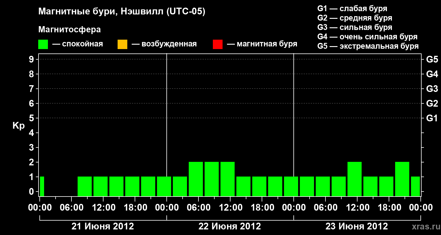 Изменения геомагнитного индекса Kp с 21 по 23 июня 2012 года для средних широт