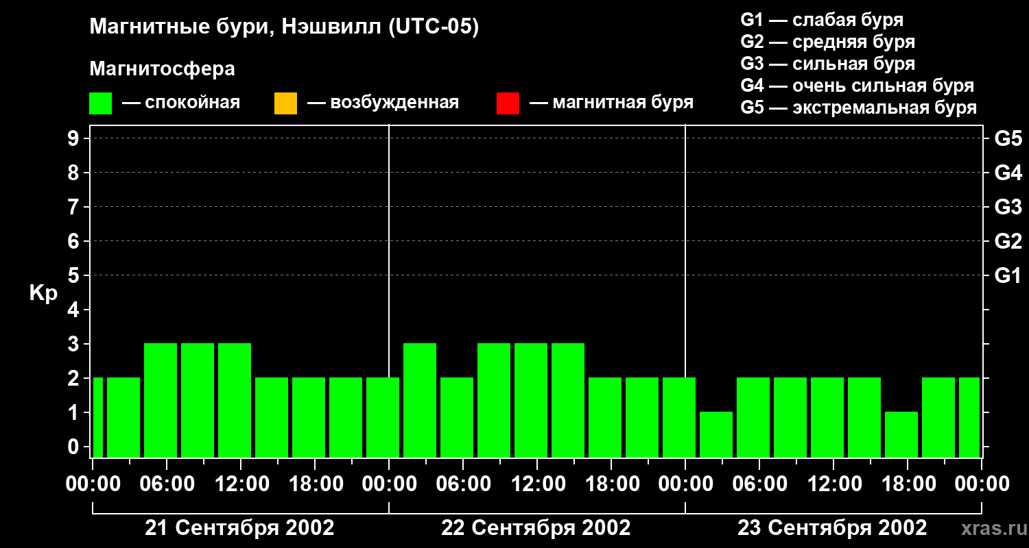 Изменения геомагнитного индекса Kp с 21 по 23 сентября 2002 года для средних широт