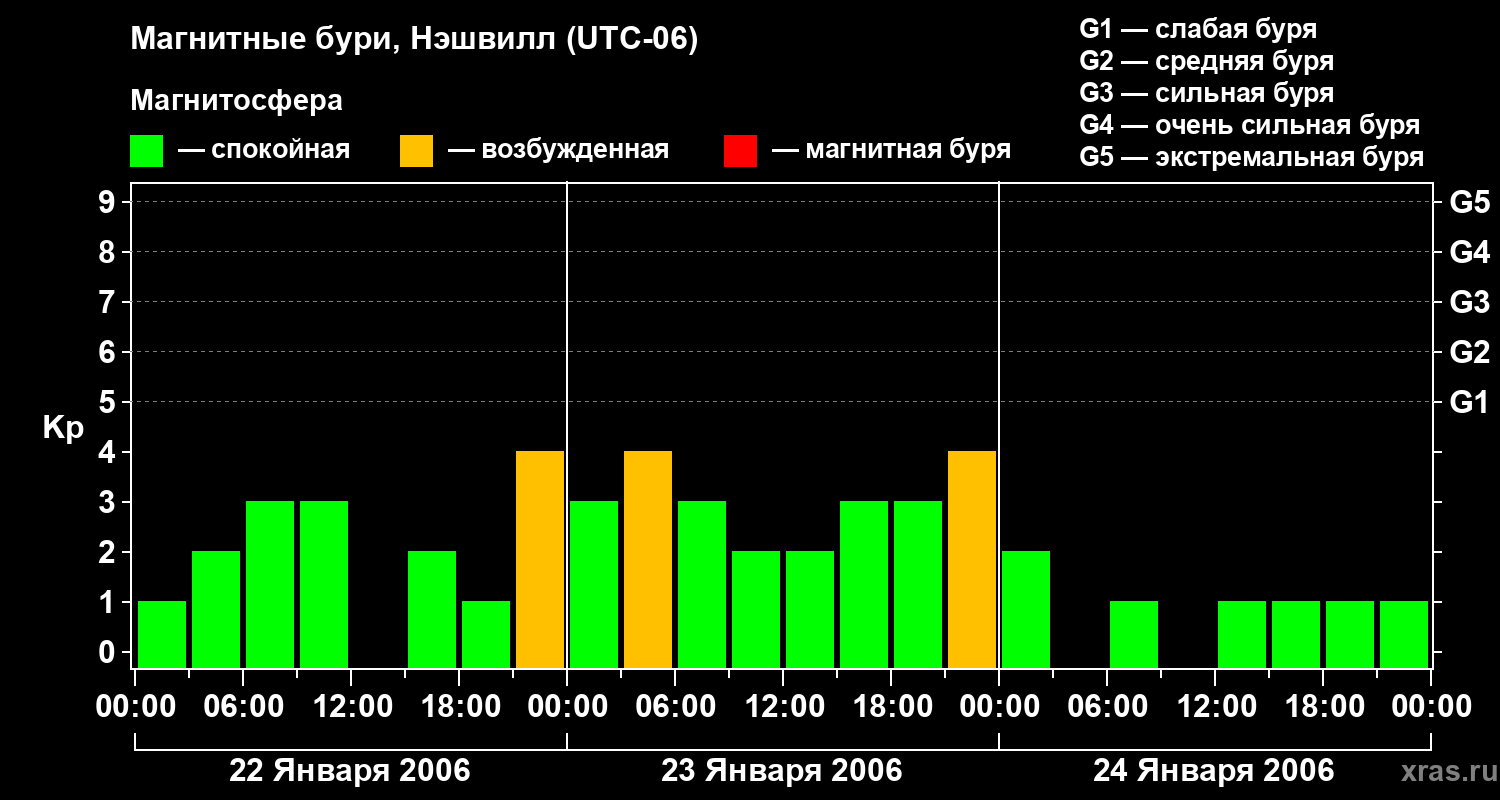 Изменения геомагнитного индекса Kp с 22 по 24 января 2006 года для средних широт
