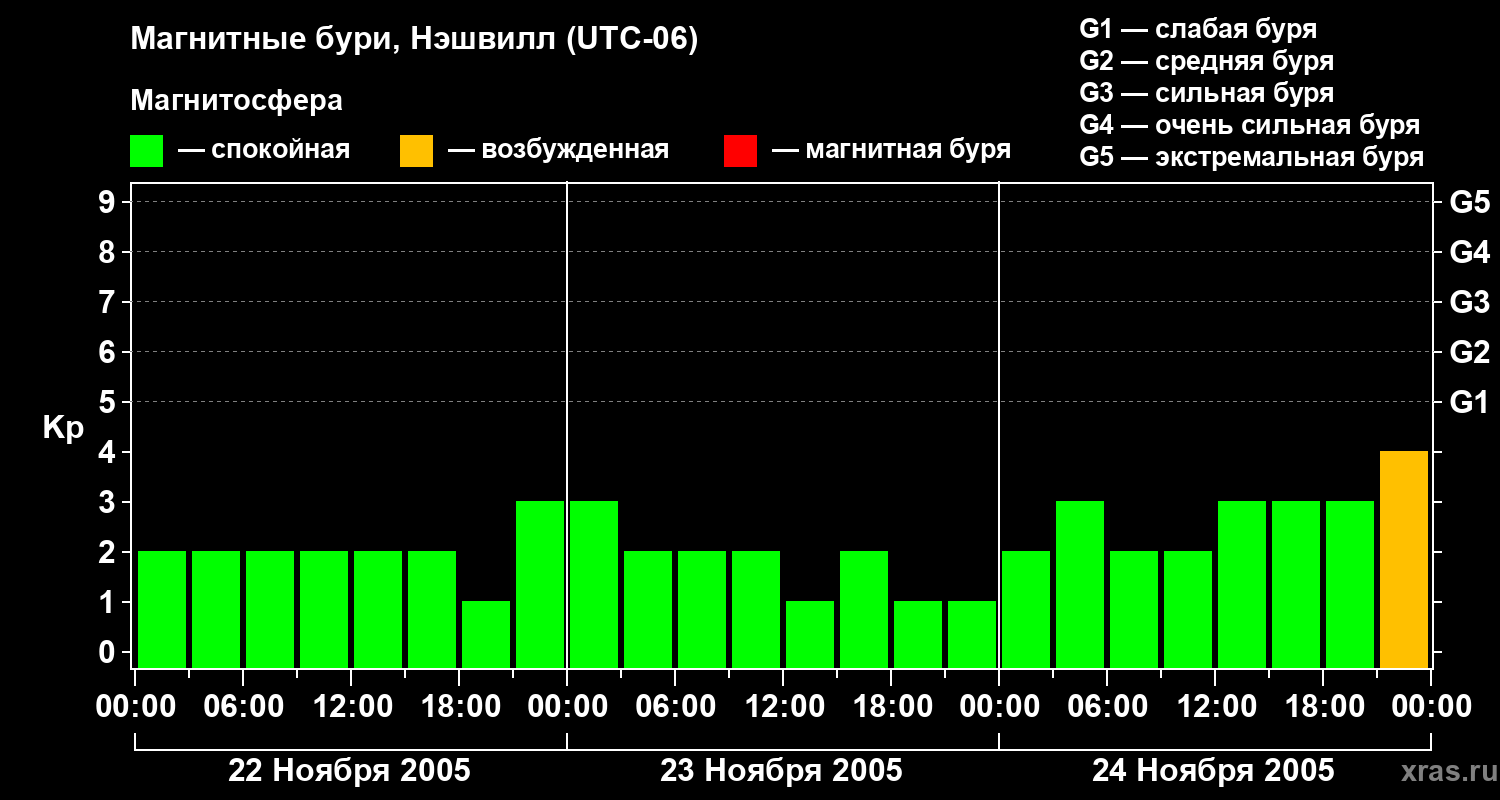 Изменения геомагнитного индекса Kp с 22 по 24 ноября 2005 года для средних широт