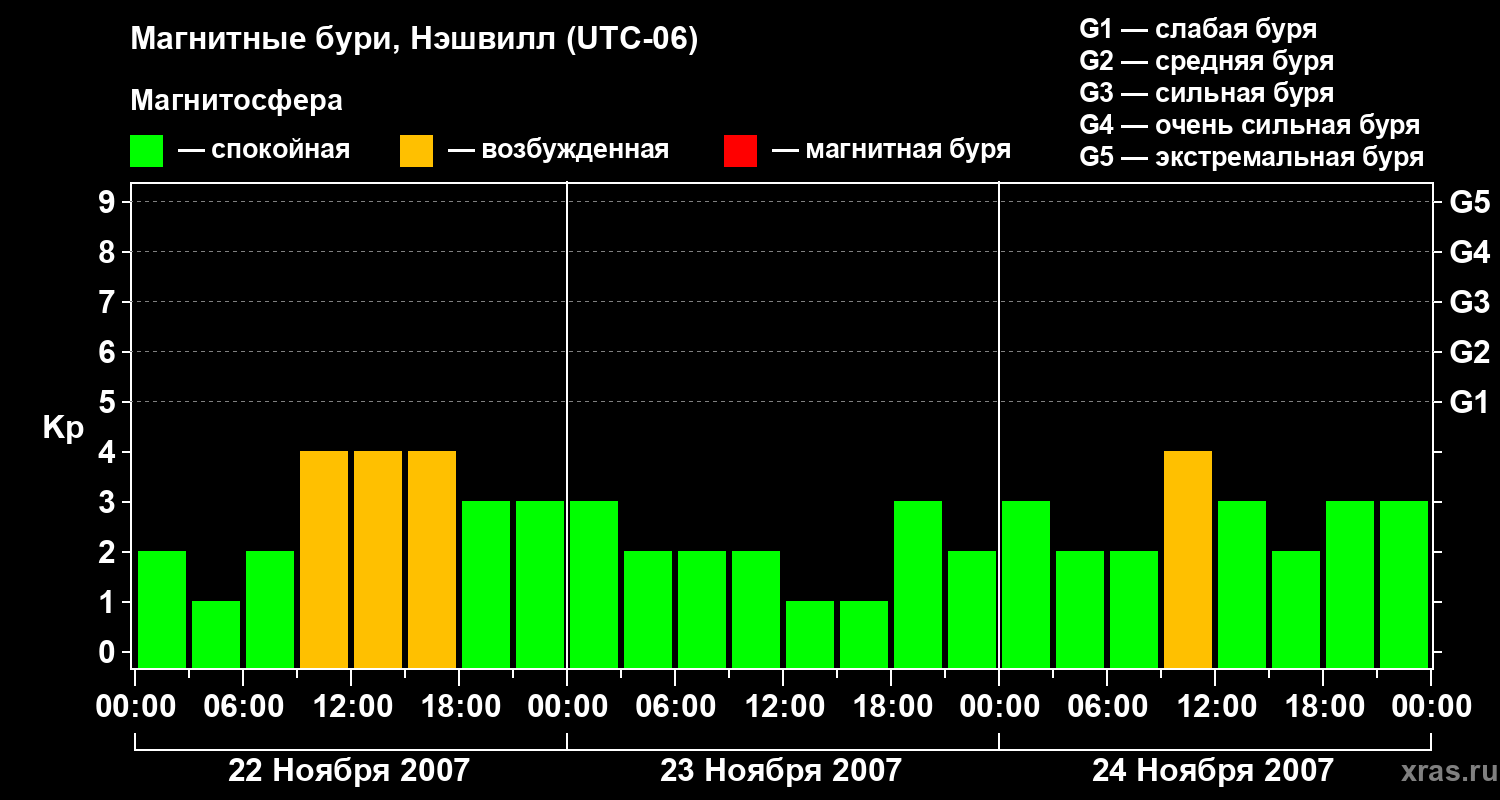 Изменения геомагнитного индекса Kp с 22 по 24 ноября 2007 года для средних широт