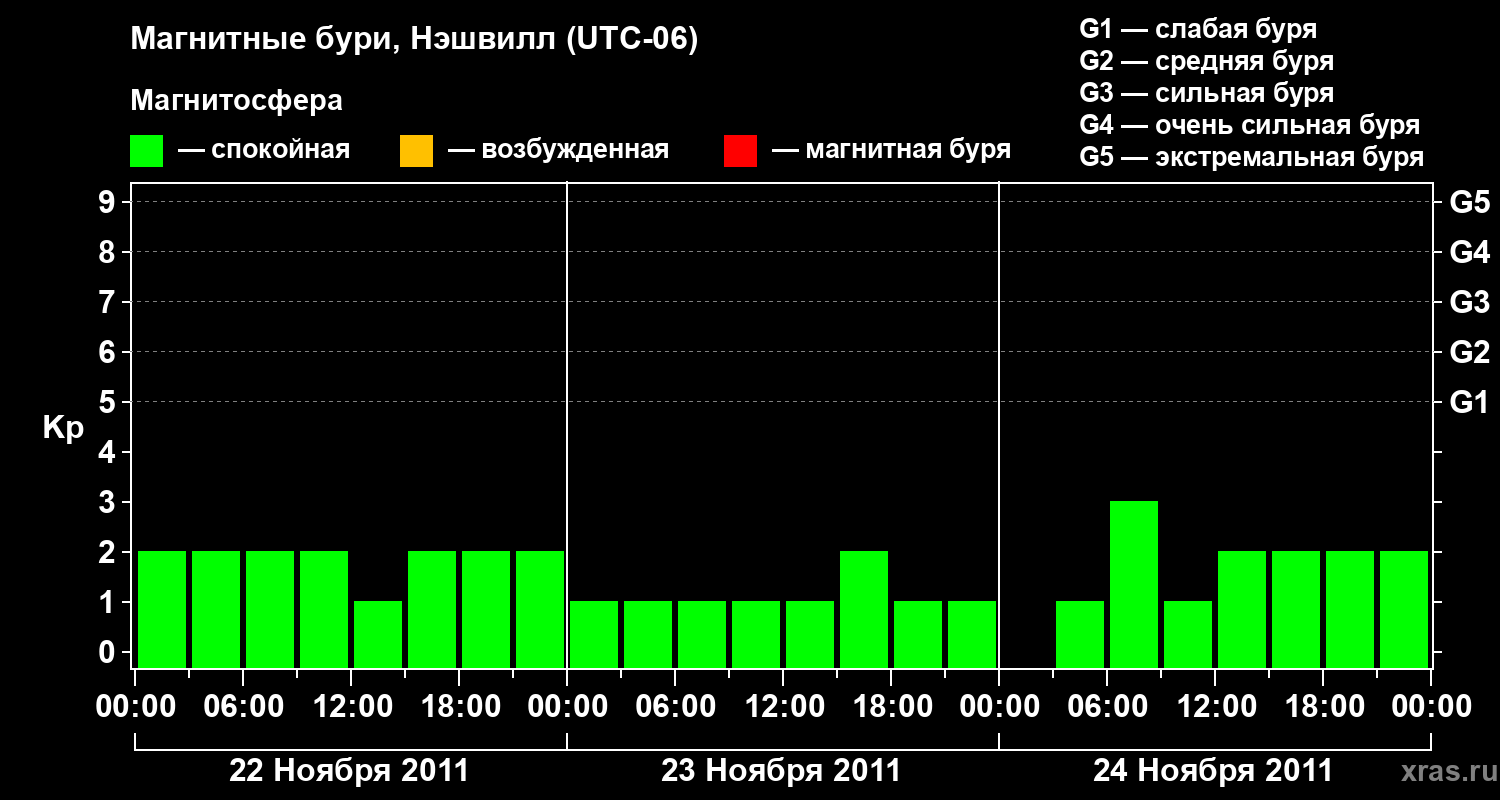 Изменения геомагнитного индекса Kp с 22 по 24 ноября 2011 года для средних широт