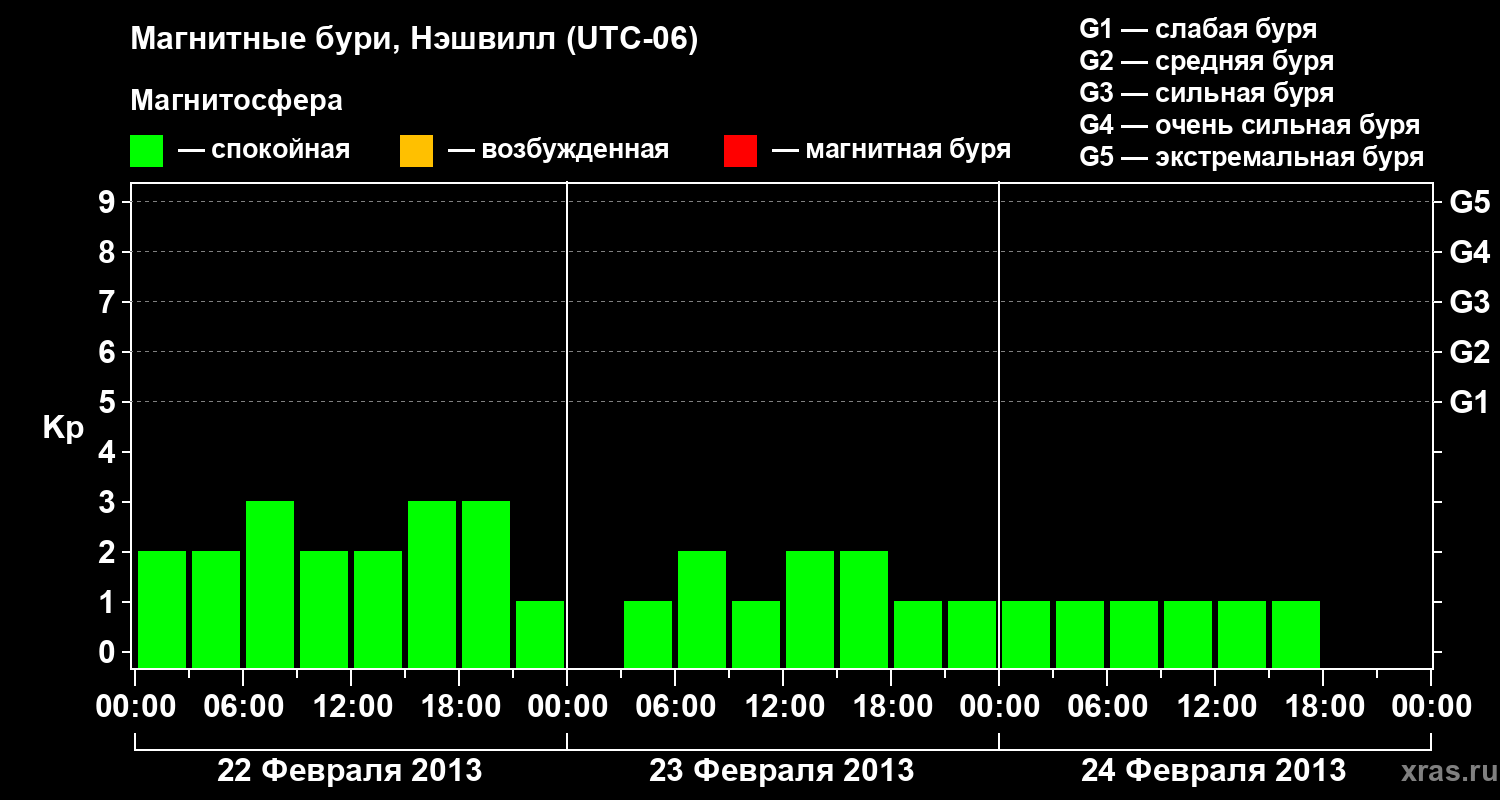 Изменения геомагнитного индекса Kp с 22 по 24 февраля 2013 года для средних широт
