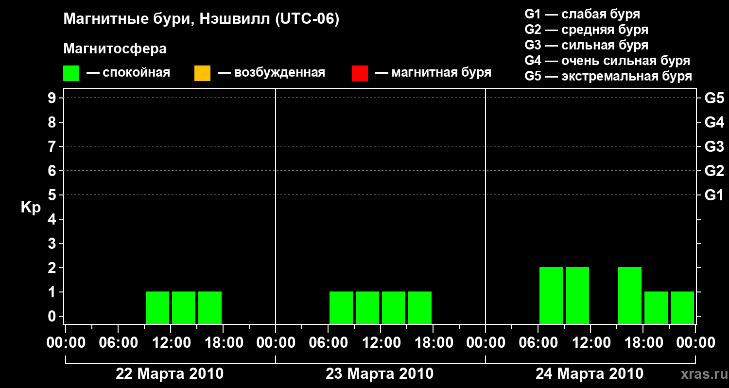 Изменения геомагнитного индекса Kp с 22 по 24 марта 2010 года для средних широт