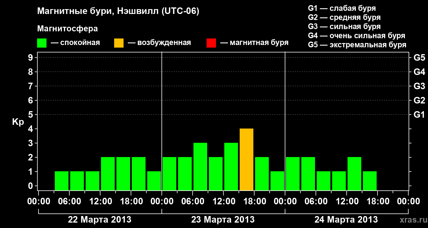 Изменения геомагнитного индекса Kp с 22 по 24 марта 2013 года для средних широт