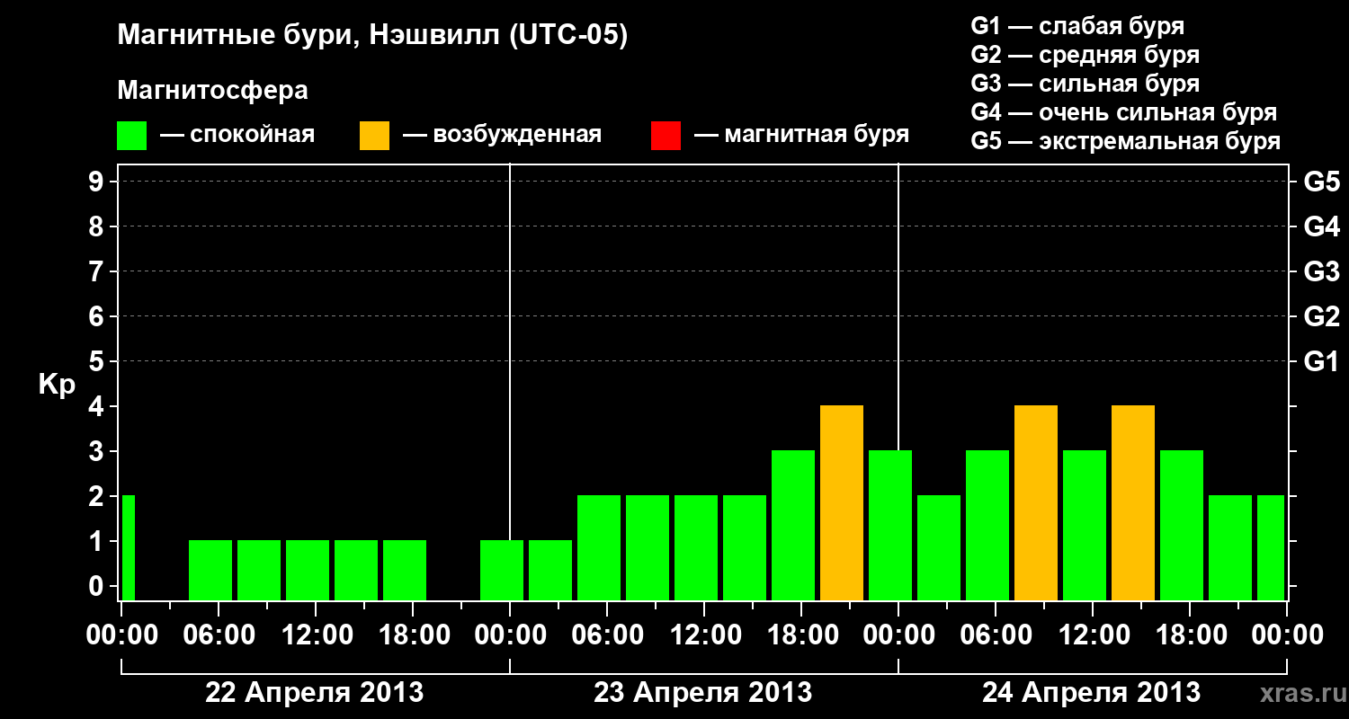 Изменения геомагнитного индекса Kp с 22 по 24 апреля 2013 года для средних широт